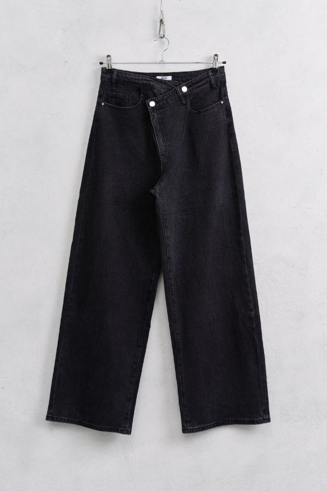 Ένα μοντέρνο μαύρο τζιν με wide leg γραμμή και ιδιαίτερο ασύμμετρο κλείσιμο στη μέση, που χαρίζει μοναδικό χαρακτήρα σε κάθε εμφάνιση. Κατασκευασμένο από ποιοτικό denim, προσφέρει άνεση και στυλ από το πρωί μέχρι το βράδυ.