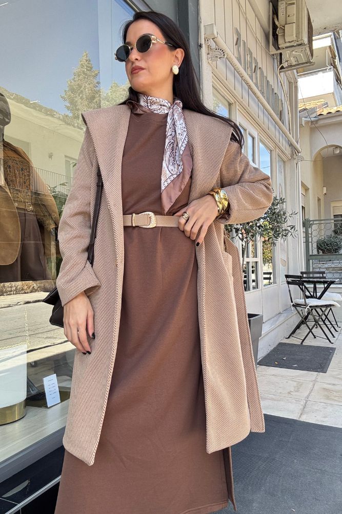 Μακρύ παλτό σε oversized γραμμή με καπιτονέ υφή. Διαθέτει κουκούλα, πλαϊνές τσέπες και μαλακή εσωτερική επένδυση για άνεση και ζεστασιά. Κλείνει με κουμπί μπροστά. Ιδανικό για κομψές, καθημερινές εμφανίσεις.