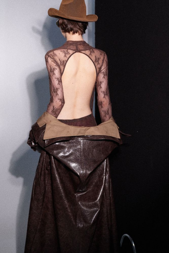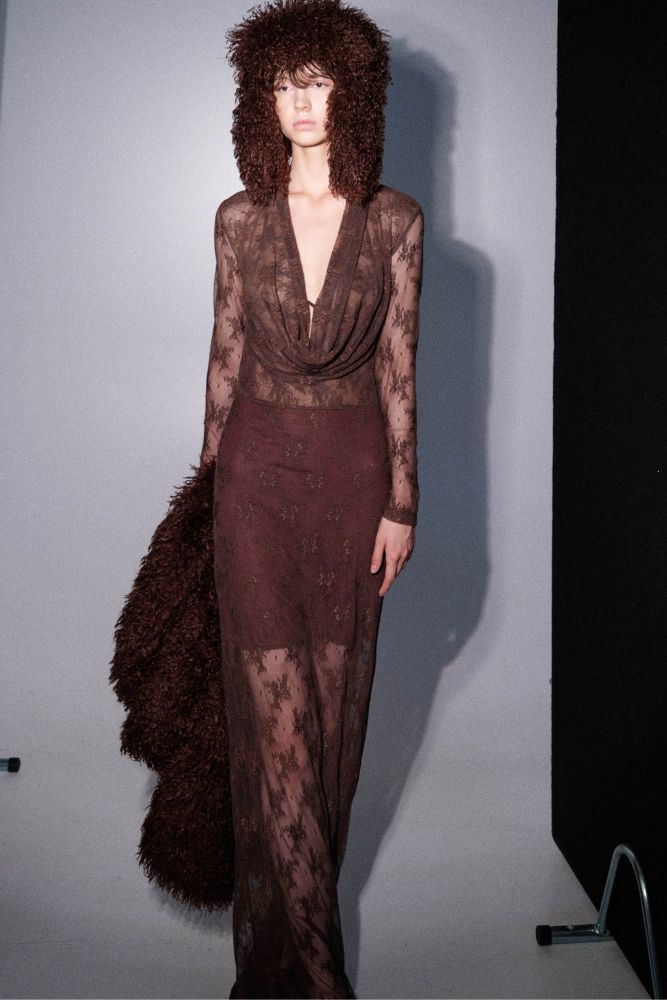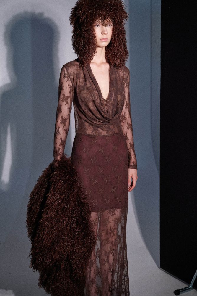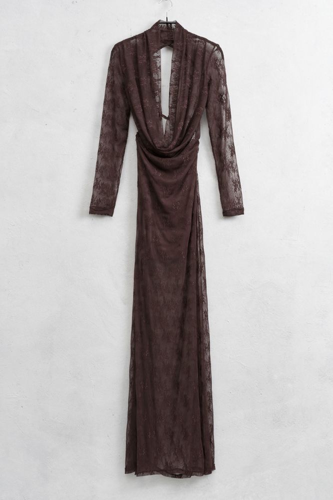 Εντυπωσιακό και θηλυκό, αυτό το maxi φόρεμα σε σοκολατί απόχρωση είναι φτιαγμένο από φίνα διάφανη δαντέλα, χαρίζοντας ακαταμάχητη κομψότητα. Διαθέτει βαθύ ντραπέ ντεκολτέ που αναδεικνύει τη θηλυκότητα, εφαρμοστή γραμμή που κολακεύει τη σιλουέτα και ανοιχτή πλάτη για μια τολμηρή αλλά εκλεπτυσμένη εμφάνιση.Το ιδανικό φόρεμα για βραδινές εξόδους, events ή ιδιαίτερες περιστάσεις όπου θέλεις να ξεχωρίσεις.